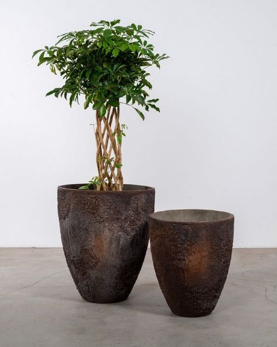 Helt speciel rustik stor konisk krukke med en helt fantastisk lavalook overflade - fremstillet i holdbar Fiberstone og kan rumme de helt store planter.
