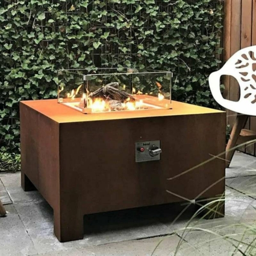 Ildbord i corten stål med glasskærm, gasbrænder og keramisk træ.
