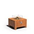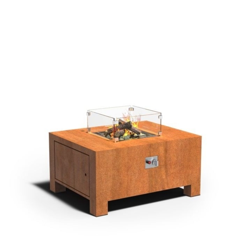 Skab hygge og varme i haven eller på terrassen - rustik ildbord i rust / corten stål med komplet gasbrænder indsats, keramisk træ og glasskærm - 3 størrelser.