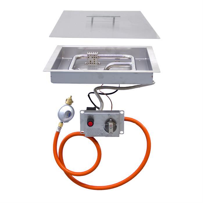 Leveres med komplet 40x40cm brænderindsats i rustfri stål, 1m gasledning, trykregulator (30mbar), elektronisk tænding, afdækningslåg, glasskærm og 3stk keramisk træ.
