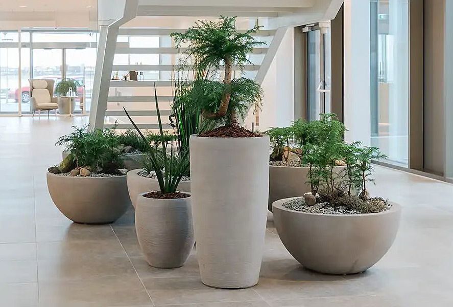 Særligt store plantekasser, krukker på hjul og aflange modeller bruges ofte i erhvervsmiljøer. De er både dekorative og praktiske og gør det muligt at flytte rundt på indretningen efter behov. Plantekasser skaber naturlige rumopdelinger uden at lukke rummet af, hvilket passer perfekt til moderne og fleksible arbejdspladser.