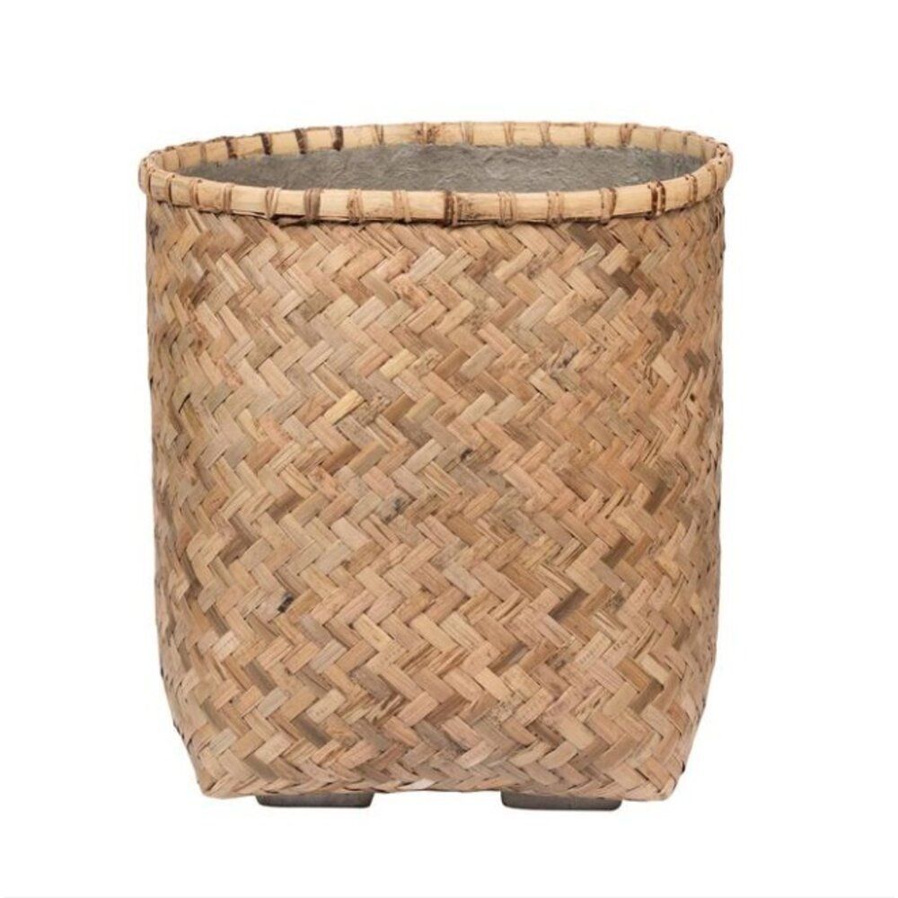 Særpræget og flot firkantet plantekrukke med opstøbt base i cement med flettet bambus udenom - krukken er med prop i bunden som skal fjernes udendørs - den står på små fødder for bedre dræn.