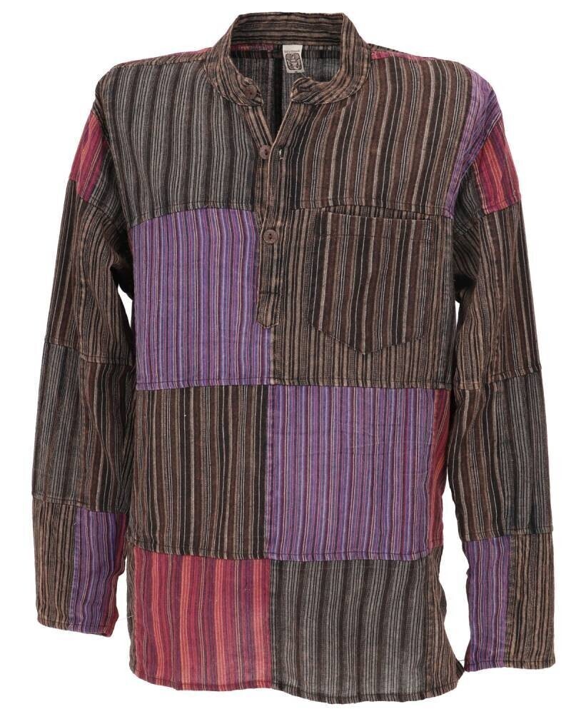 Flot anderledes langærmet ethno herreskjorte med lav krave - sammensat af flere farver og med brystlomme - Spændes øverst med knapper i coconut