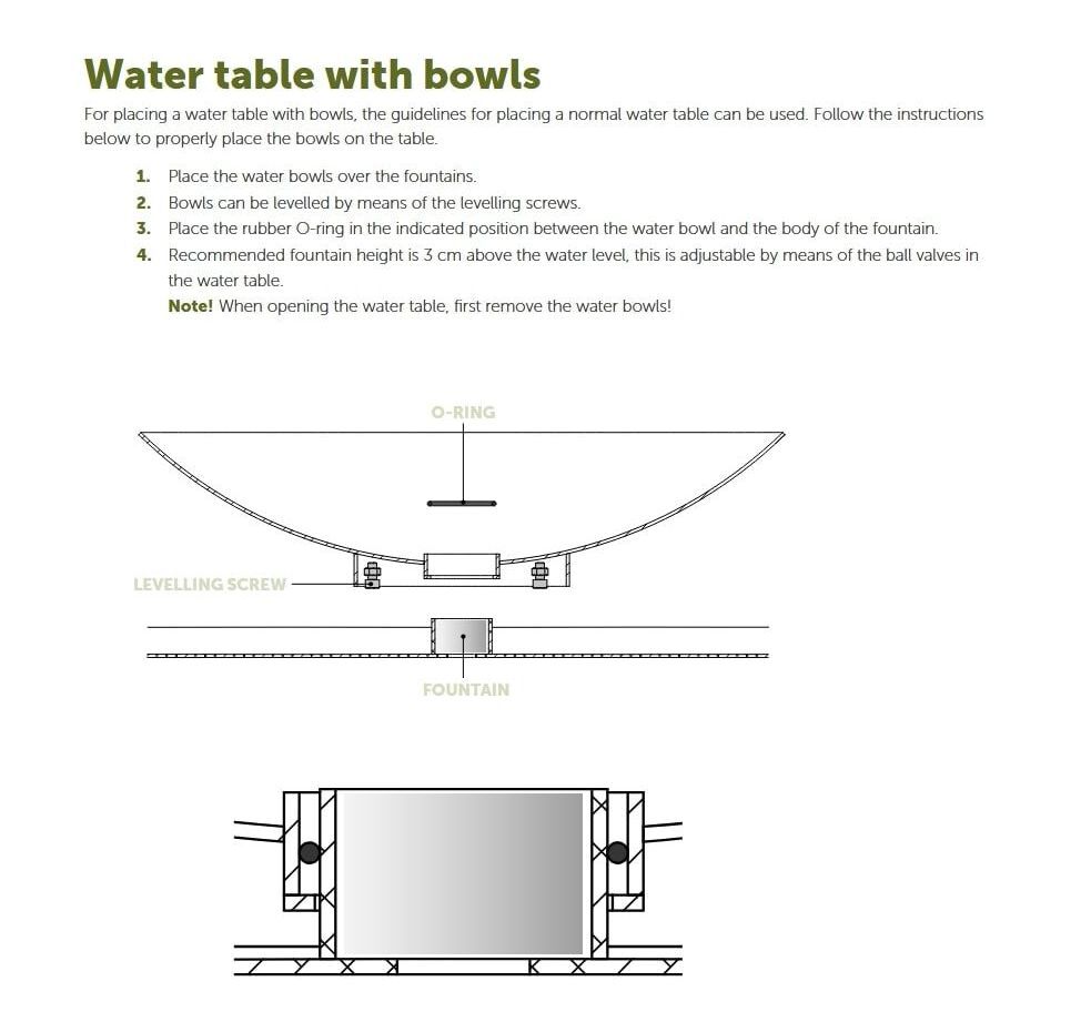 OBS: Skal frostsikres om vinteren, ved at tilsætte lidt frostvæske og sænke vandstanden til 15cm under øverste kant (pumpen kan så blive i vinteren over) - hvis pumpe tages ind, skal den ligge i vand. Strøm skal altid frakobles hvis pumpen overvintrer i fontænen.
