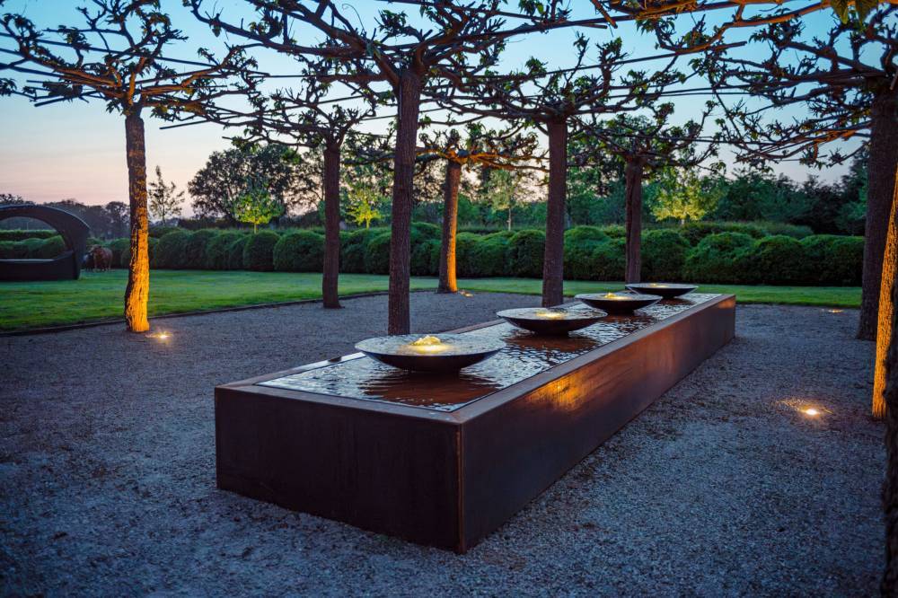 Store vandfontæner i cortenstål med vandskåle og led lys
