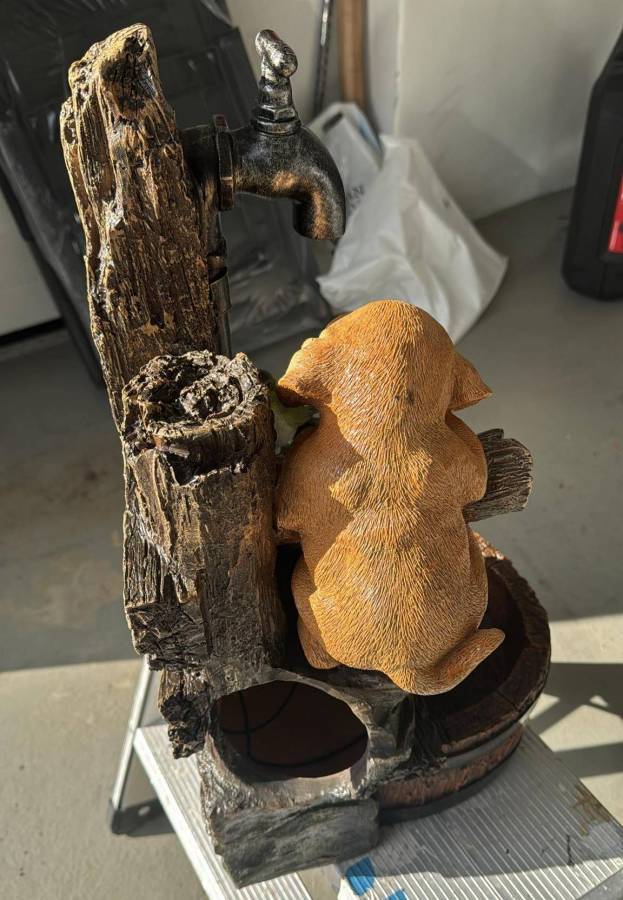 En vandkunst som skaber en super hyggelig stemning for både børn og voksne. Vandfontænen er lavet i resin/glasfiber og er med vandhane og 2 brønde med vand. Der er LED lys i begge kar og fontænen her har den helt rigtige vandlyd.